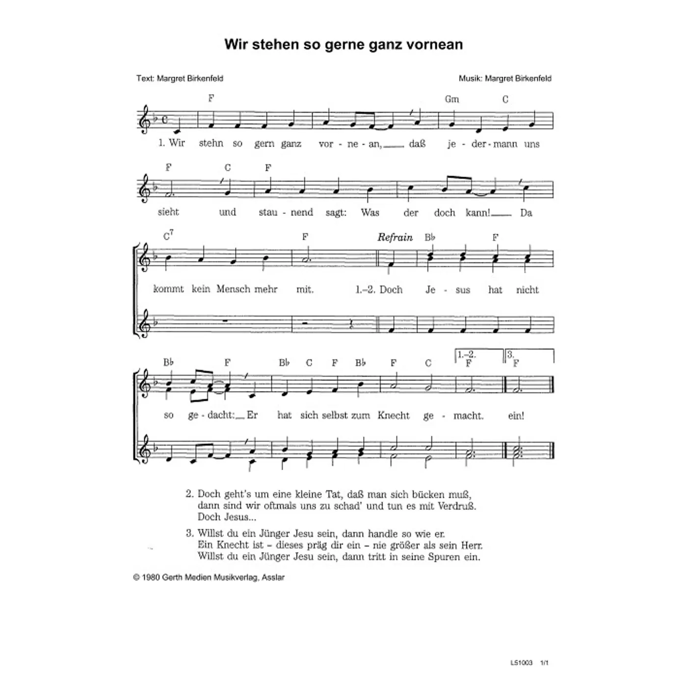 Wir stehn so gern ganz vorne an (diese Variante haben Sie gerade ausgewählt) (Kinderchor, dreistimmig, mit Akkorden, F-Dur) Margret Birkenfeld (Komposition, Text, Chorsatz) |